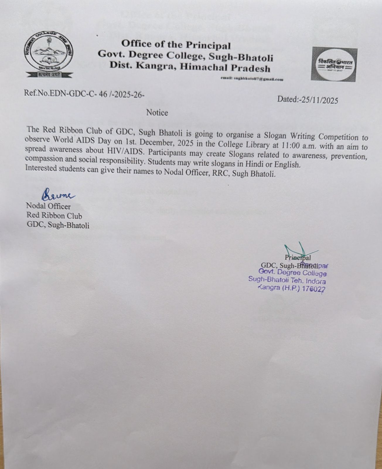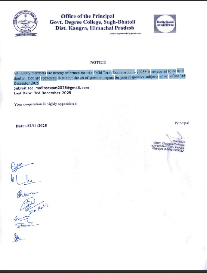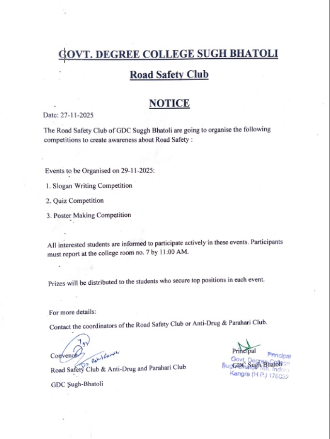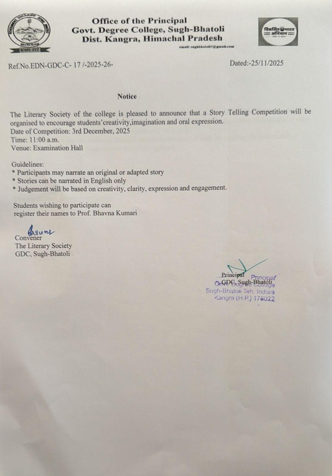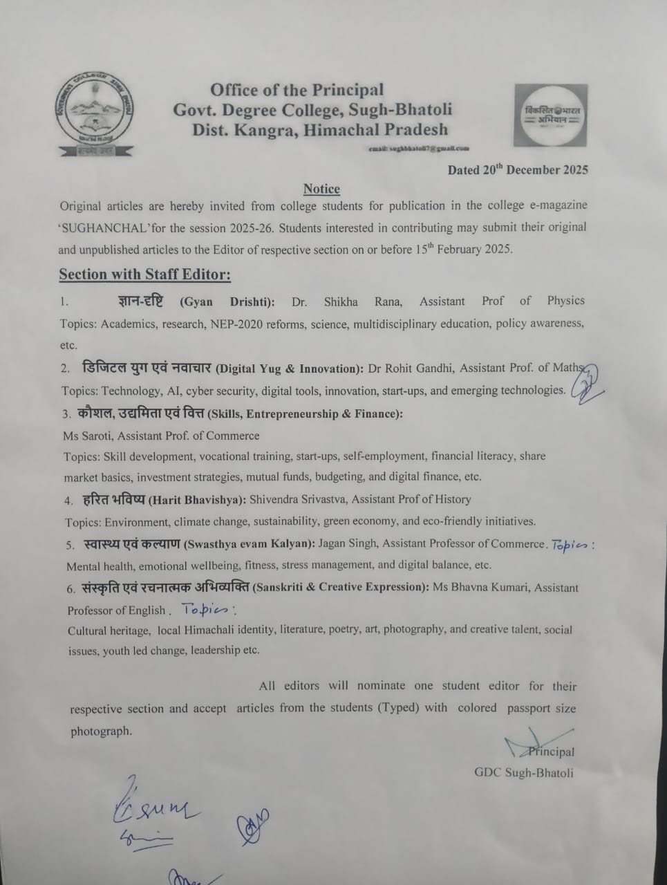 A real applause goes to the sacred soul, public representatives, local and then staff whose abundant efforts proved when the college was taken over by the Govt. of Himachal Pradesh as Government Degree College Sugh Bhatoli, vide Order No EDN-A-Ka(1)-6/2015 of Pr. Secretary (Higher Education) to the Govt. of Himachal Pradesh dated 6th August 2016 . Since its functioning day , the College has been imparting efficient education in different streams namely BA., B.Com and B.Sc (Non- Medical).