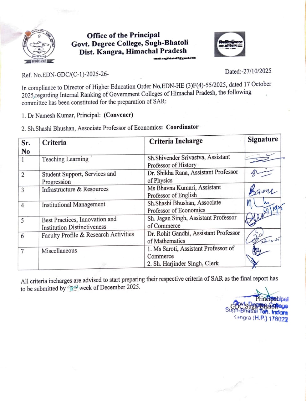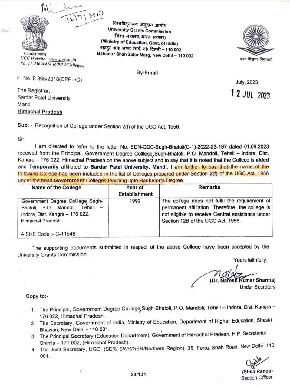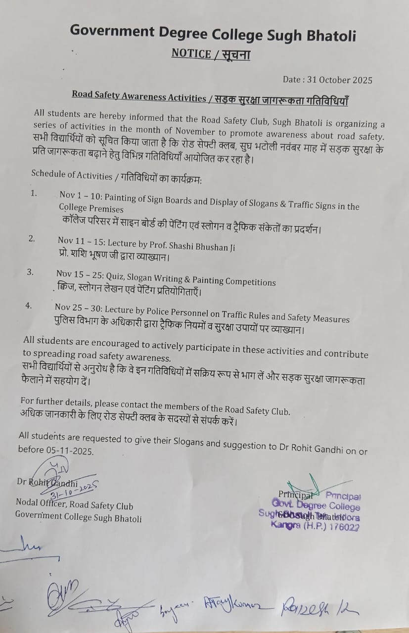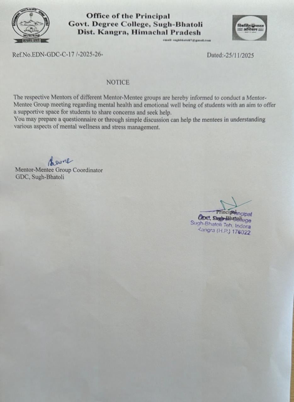 A real applause goes to the sacred soul, public representatives, local and then staff whose abundant efforts proved when the college was taken over by the Govt. of Himachal Pradesh as Government Degree College Sugh Bhatoli, vide Order No EDN-A-Ka(1)-6/2015 of Pr. Secretary (Higher Education) to the Govt. of Himachal Pradesh dated 6th August 2016 . Since its functioning day , the College has been imparting efficient education in different streams namely BA., B.Com and B.Sc (Non- Medical).